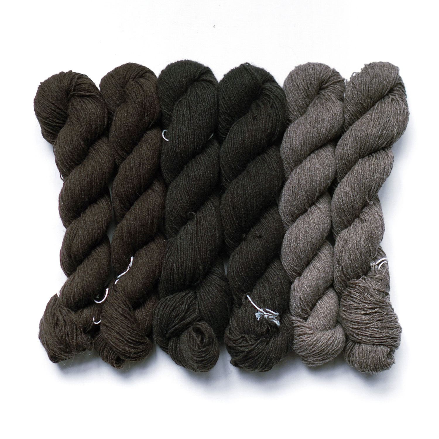 另外,這系列的顏色,與其他手染色系列截然不同。除了保留了原色的灰與咖啡兩色,其他的顏色則都是染在天然的灰色基底之上(以往都是染在白色線材上)。確實少了點明亮,但也可以說它更具深度與層次,迷人而耐看。