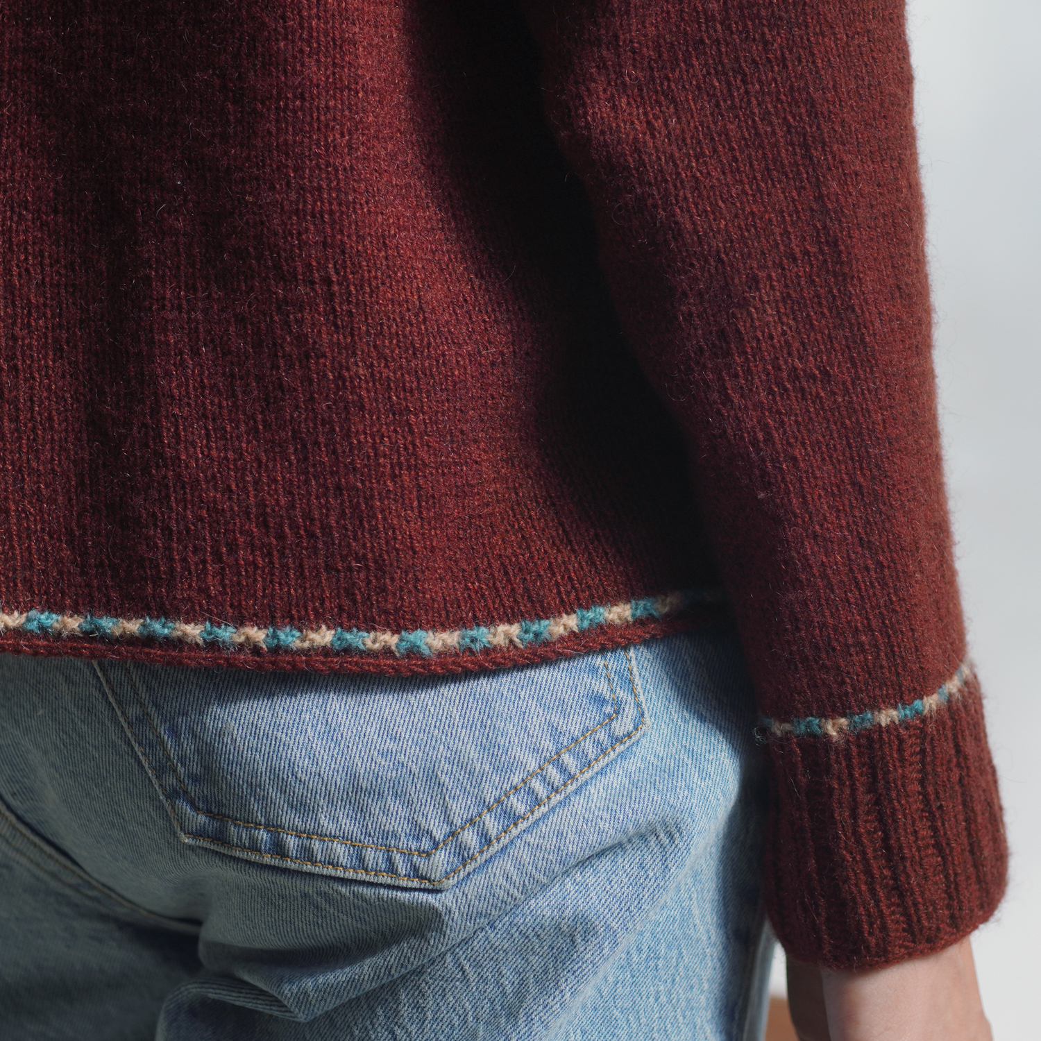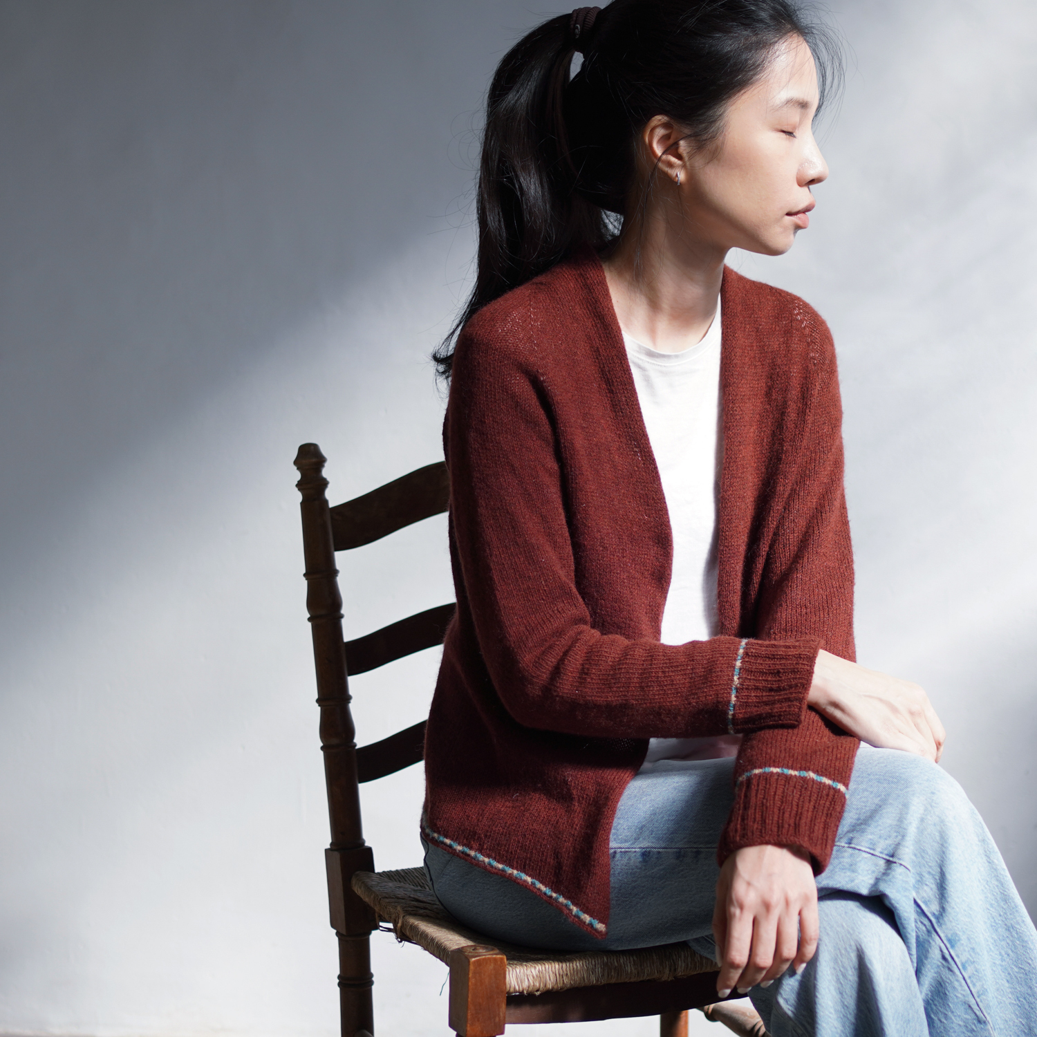 我們為這個材料包的主體(主線),提供兩種線材選擇。 一種是我們經典、親膚、顏色深沉而迷人的犛牛絨粗紡線, 另一種則是使用「剛好」柔軟、樸實而蓬鬆的小尾寒羊毛粗紡線。 兩者都十分輕盈,是一件能在日常生活中自在穿著、 同時兼具舒適感的開襟外套。