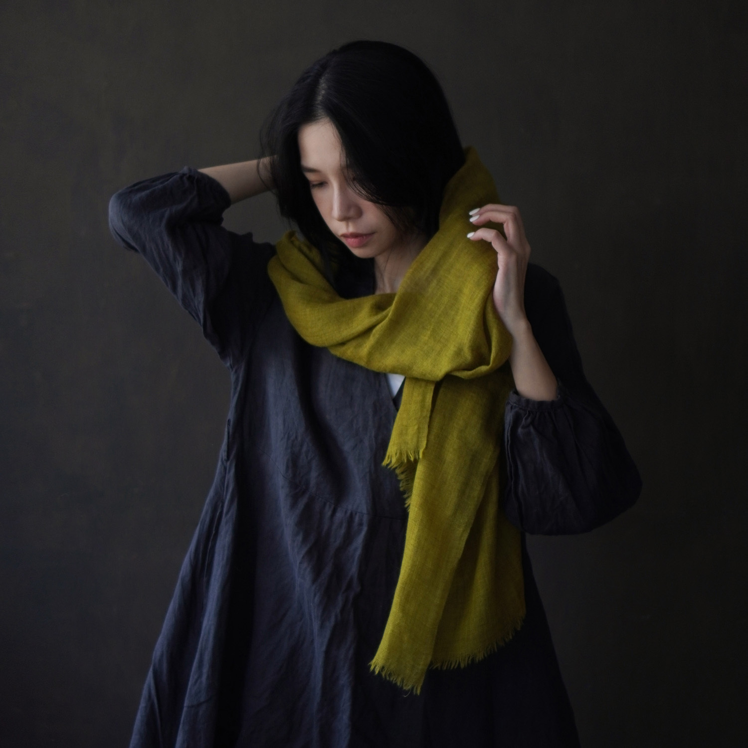 手工染色結合犛牛絨灰色基底,讓披肩除了明亮外,又保有灰色的底蘊,不過度搶戲,十分適合日常的穿戴使用。