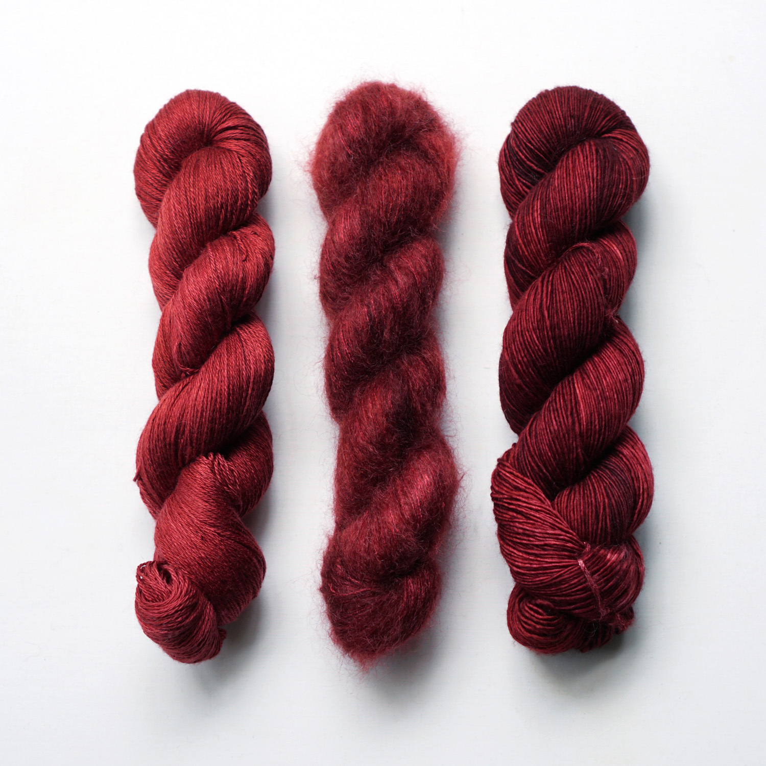 不同粗細、成分、特性的線材,適合打什麼樣的作品都不一樣。而同樣的顏色,染在不同的線材種類上,顏色表現也會有所差異。