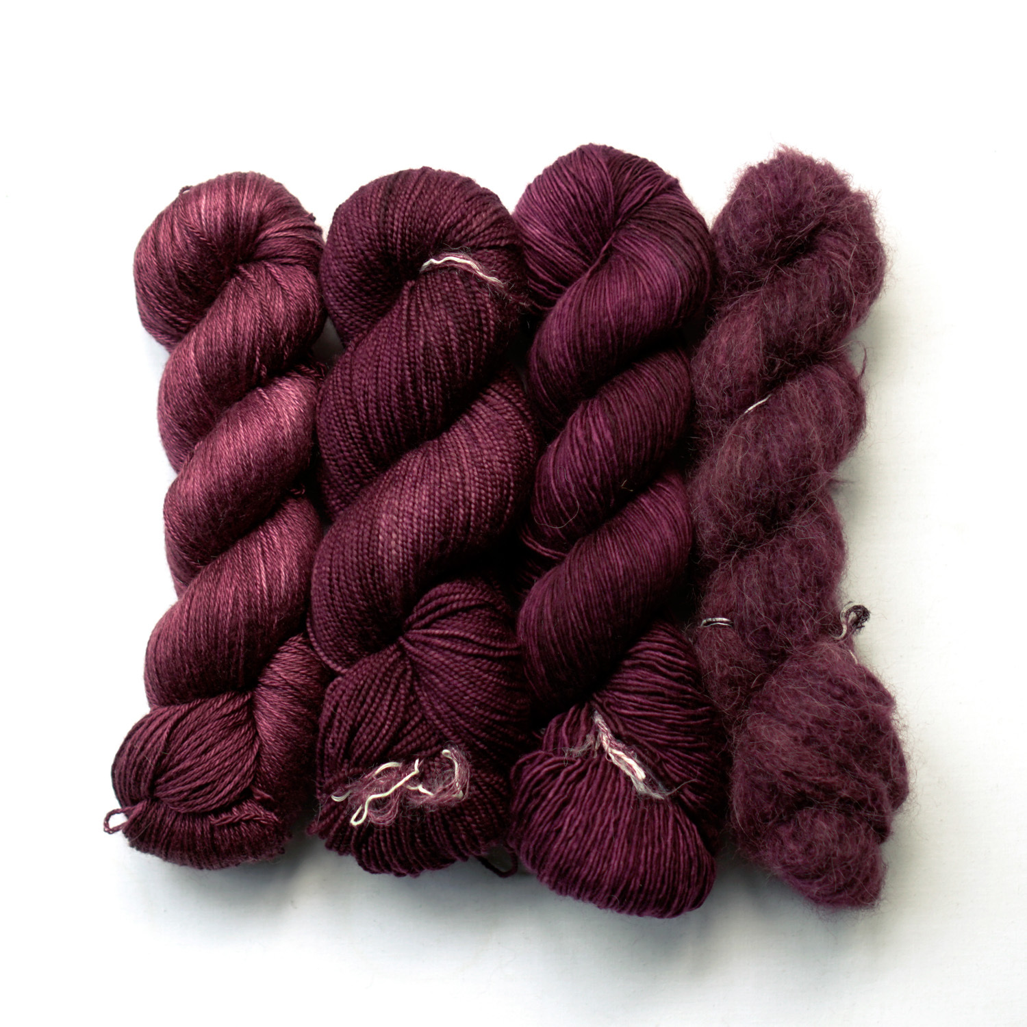 左至右|蠶絲犛牛絨、HT美麗諾、單股美麗諾、羊駝毛海