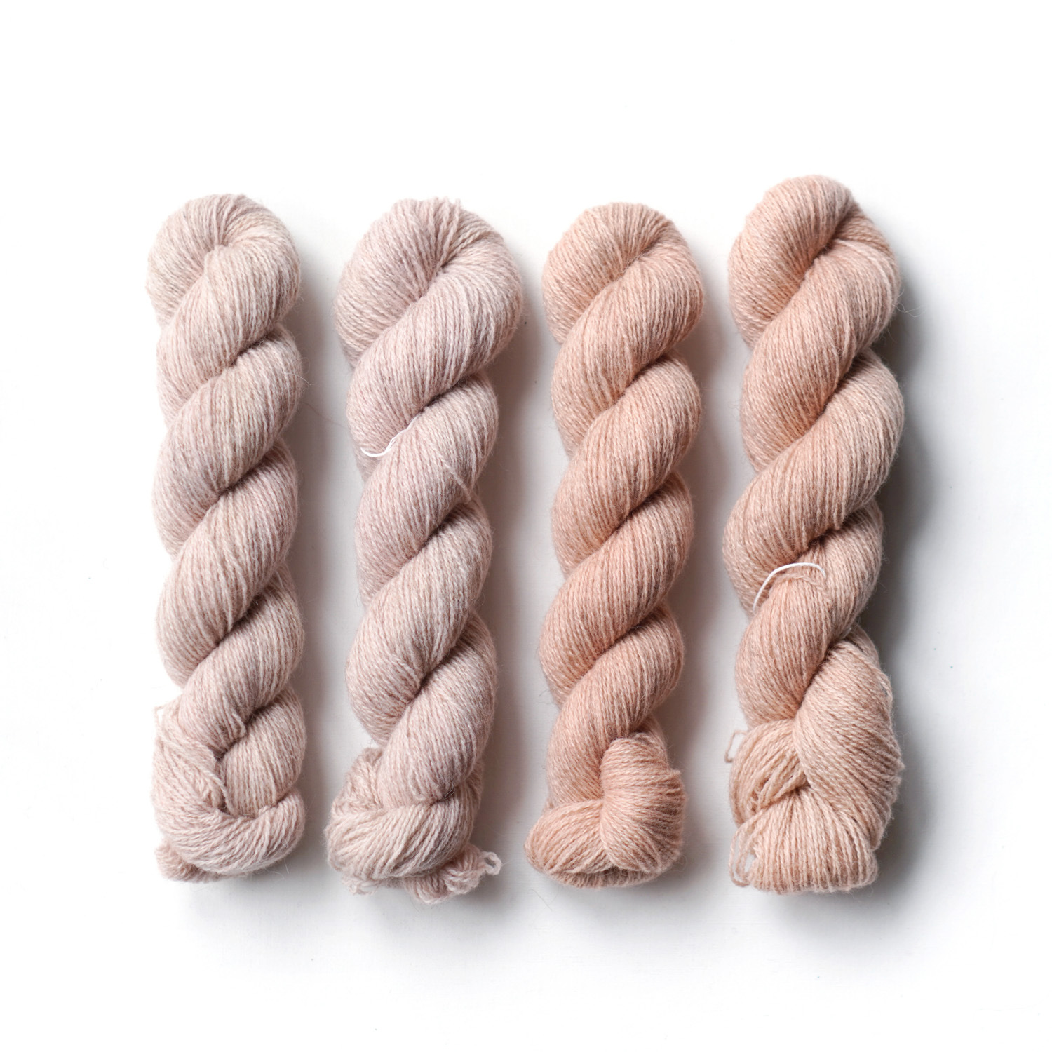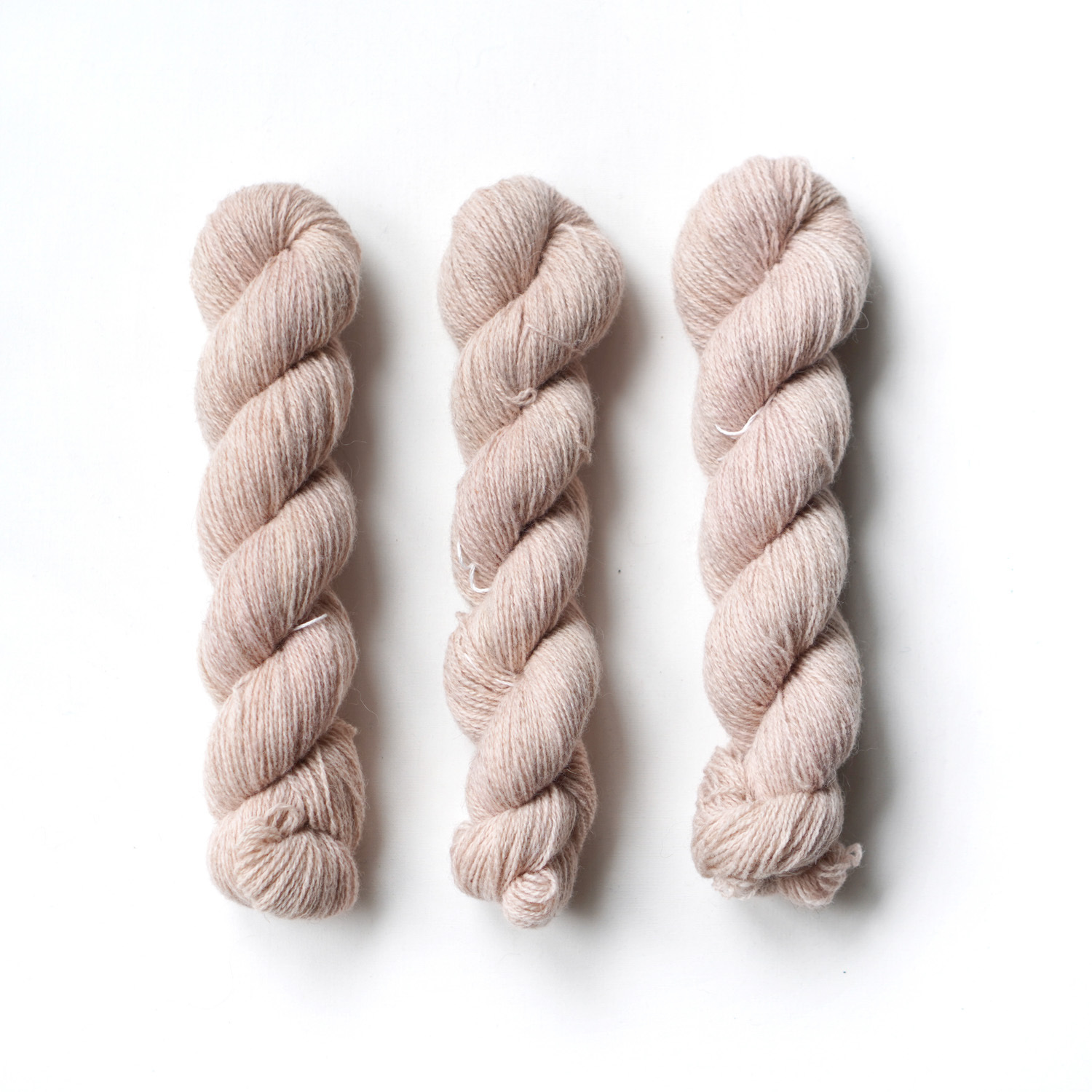 這是一款粗紡(woolen spun)的羊毛線,保留了羊毛自然的捲曲與纖維間的空氣。線體蓬鬆而輕盈,未經漂白的原毛仍混著細微的灰與白,讓整個系列的色澤,都透出一種略帶溫度、霧樣的朦朧感。