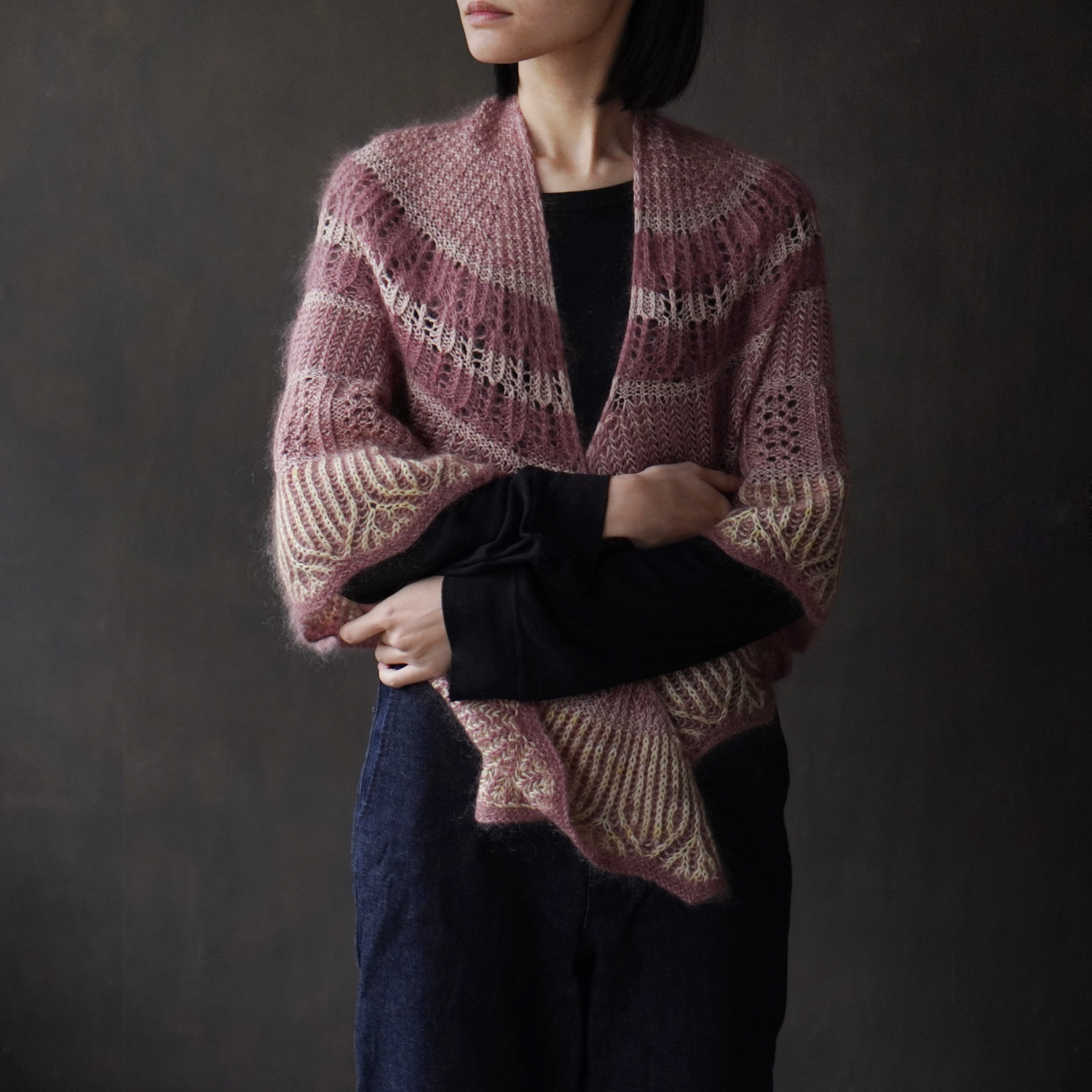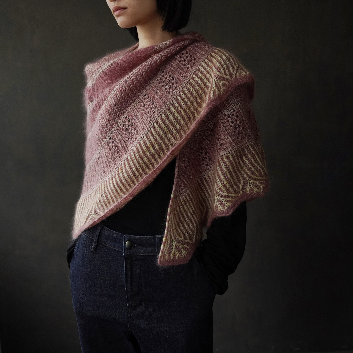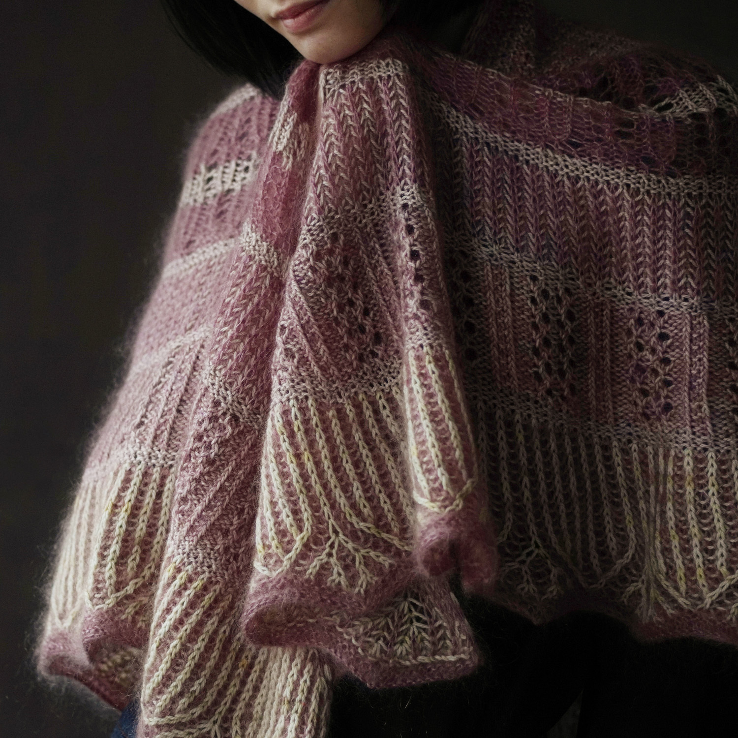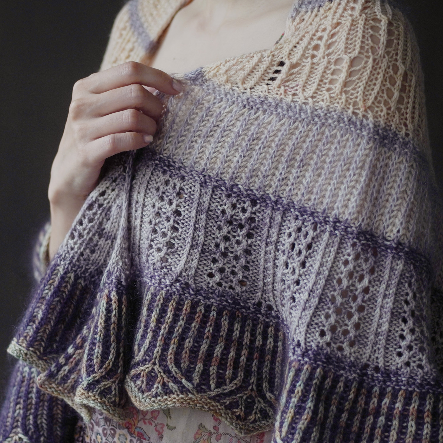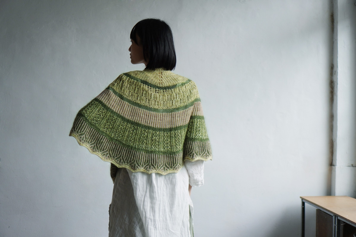 設計師使用了 sport 粗細的犛牛美麗諾線(50%犛牛、50% 美麗諾羊毛)搭配真絲毛海,為這個披肩增添了豐厚的毛感。