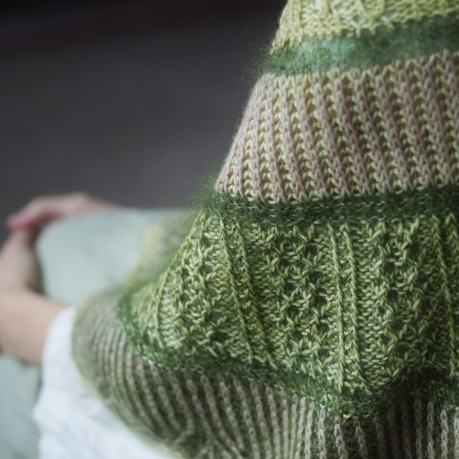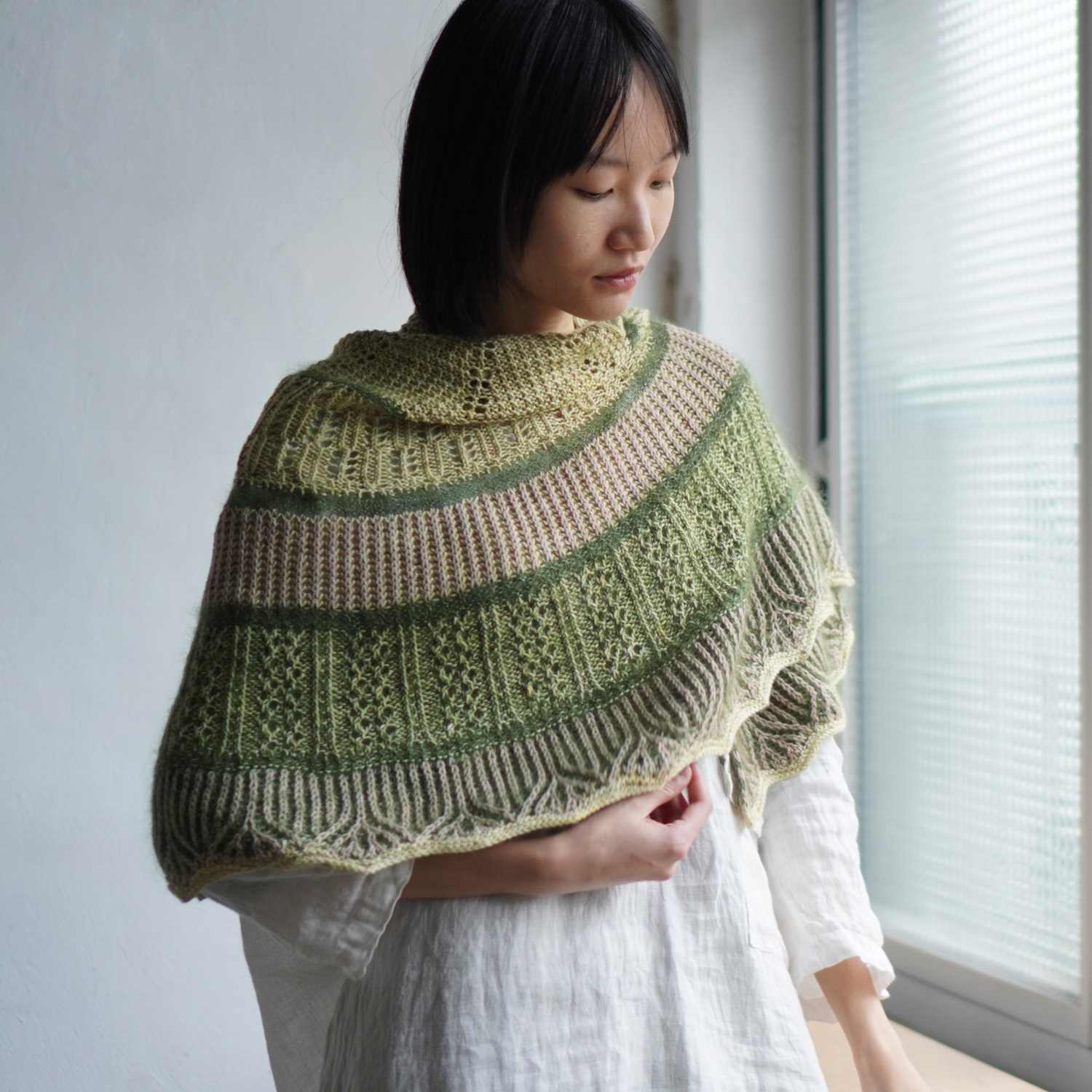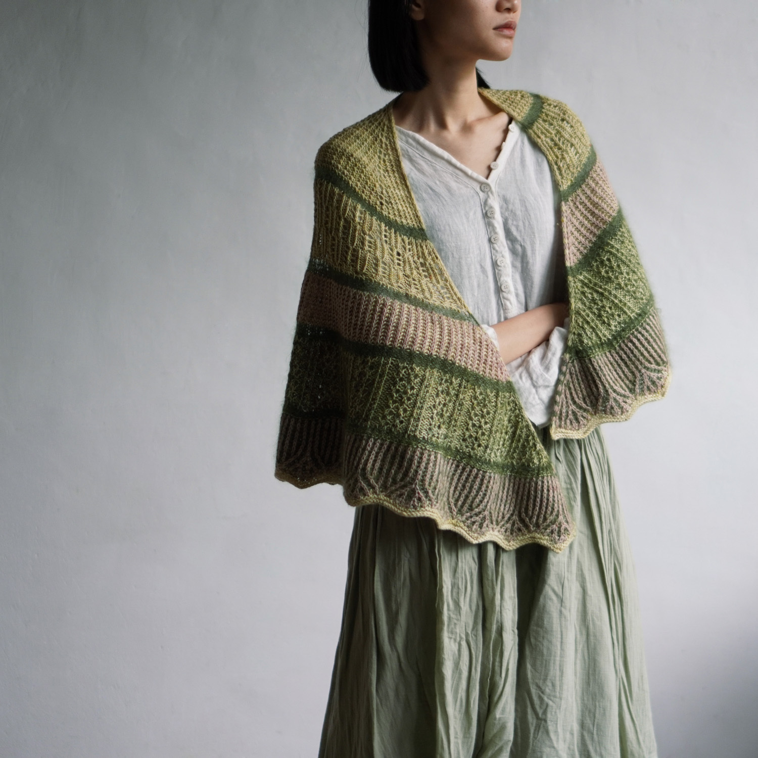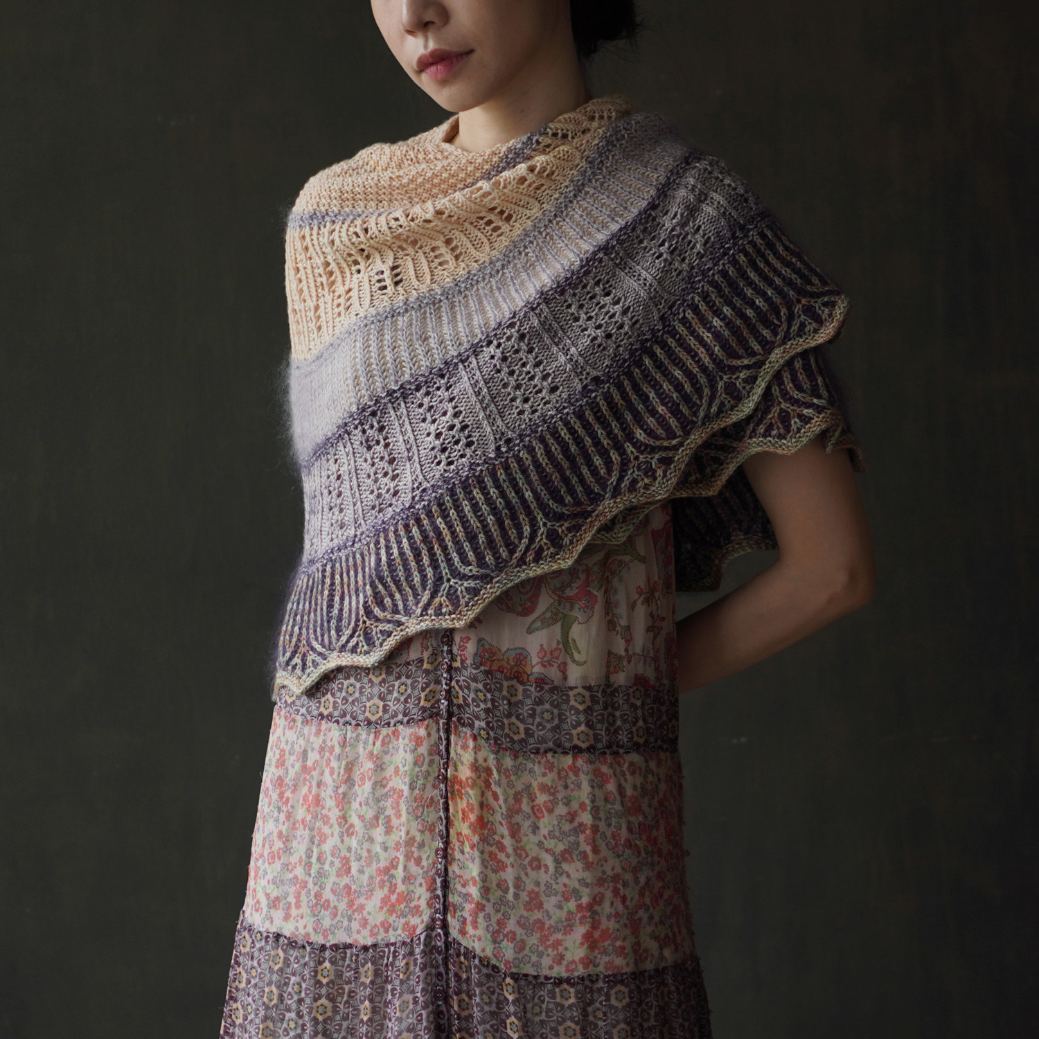 設計師使用了 sport 粗細的犛牛美麗諾線(50%犛牛、50% 美麗諾羊毛)搭配真絲毛海,為這個披肩增添了豐厚的毛感。