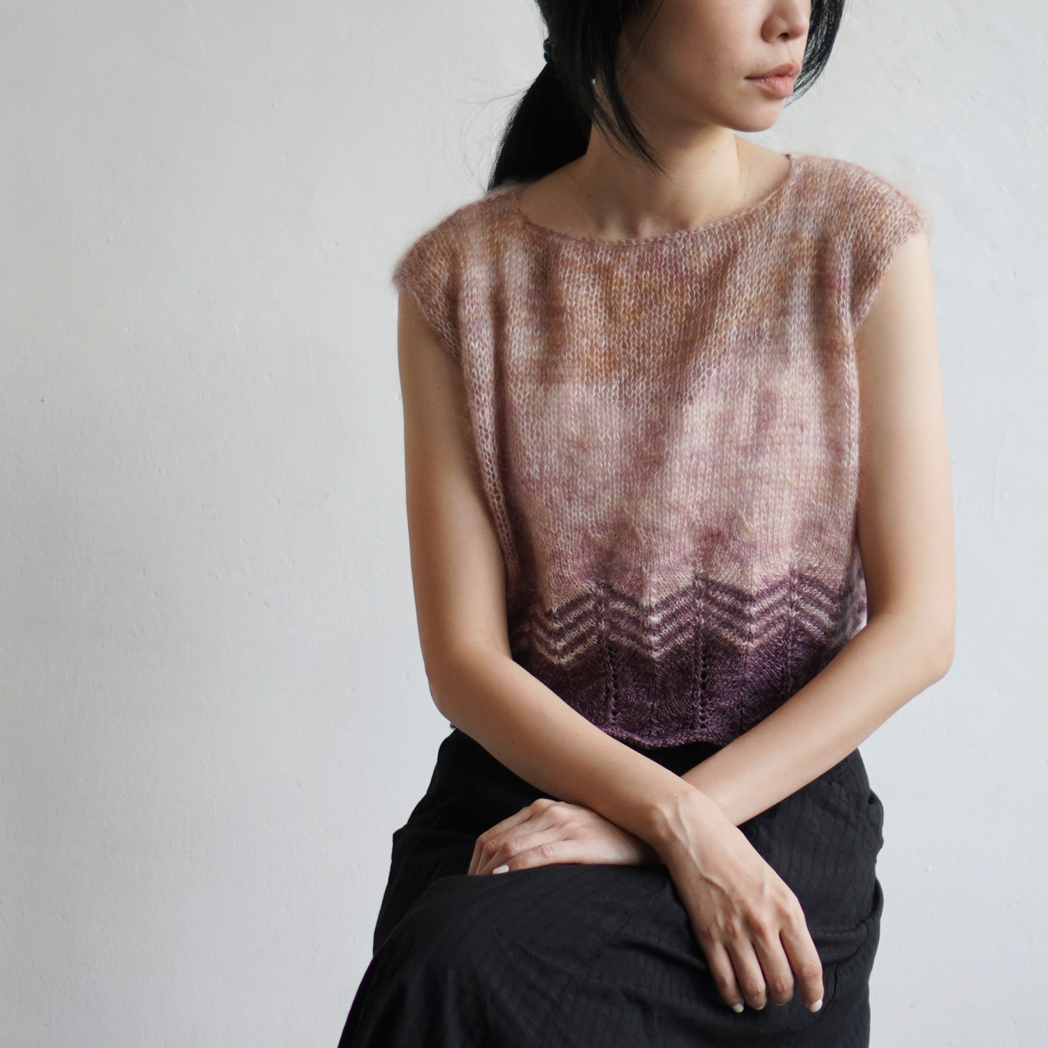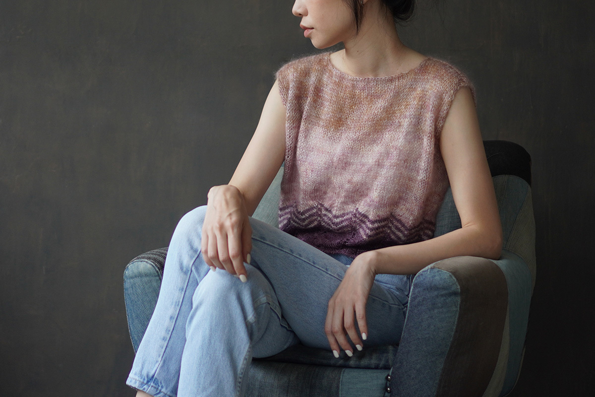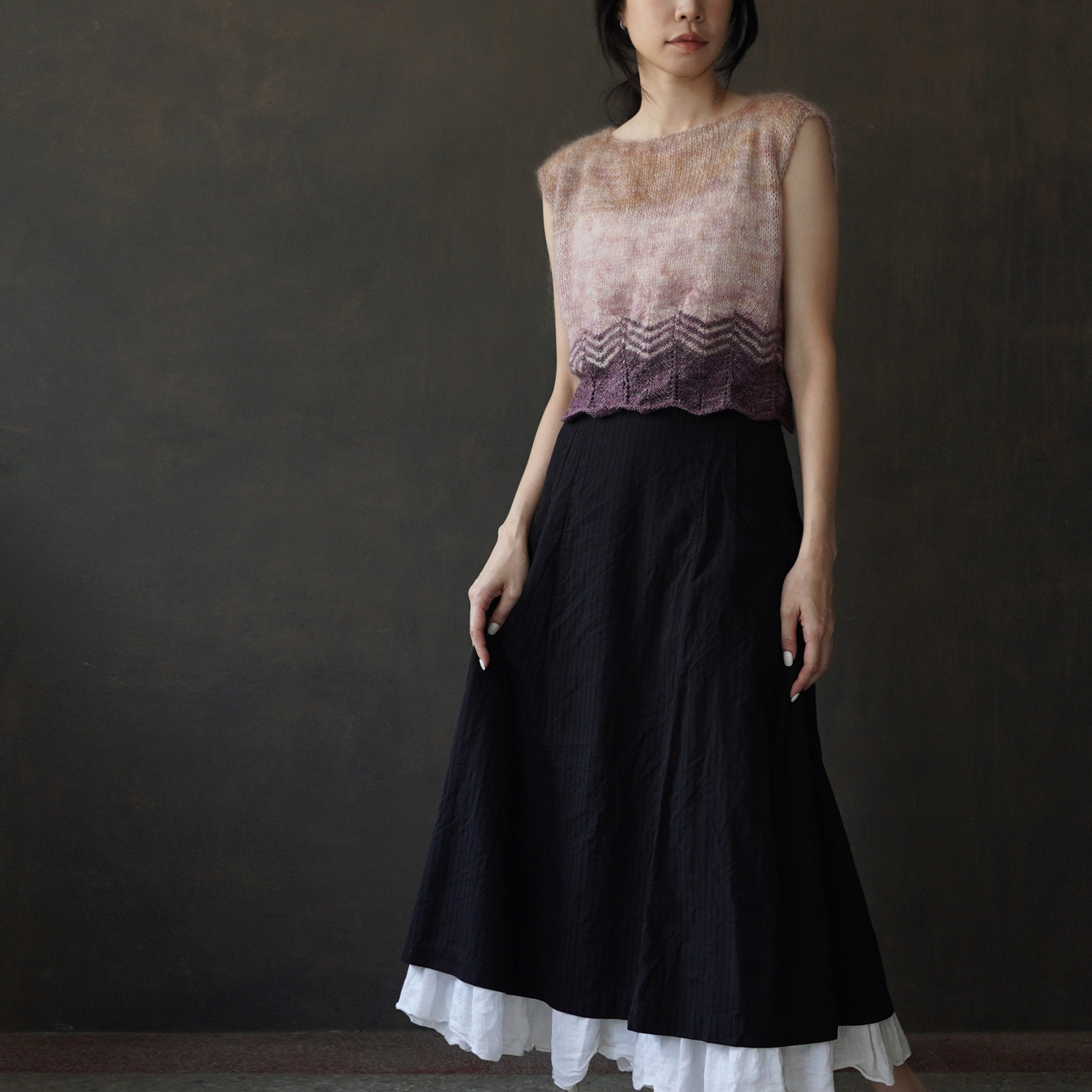 Fingering的線織成單色的W條紋在下襬,為上衣的下方增添些重量。利用絲毛海織一件無袖的上衣,整件上衣輕柔,還可以微微透出裡面搭配的洋裝或是襯底的質地。
