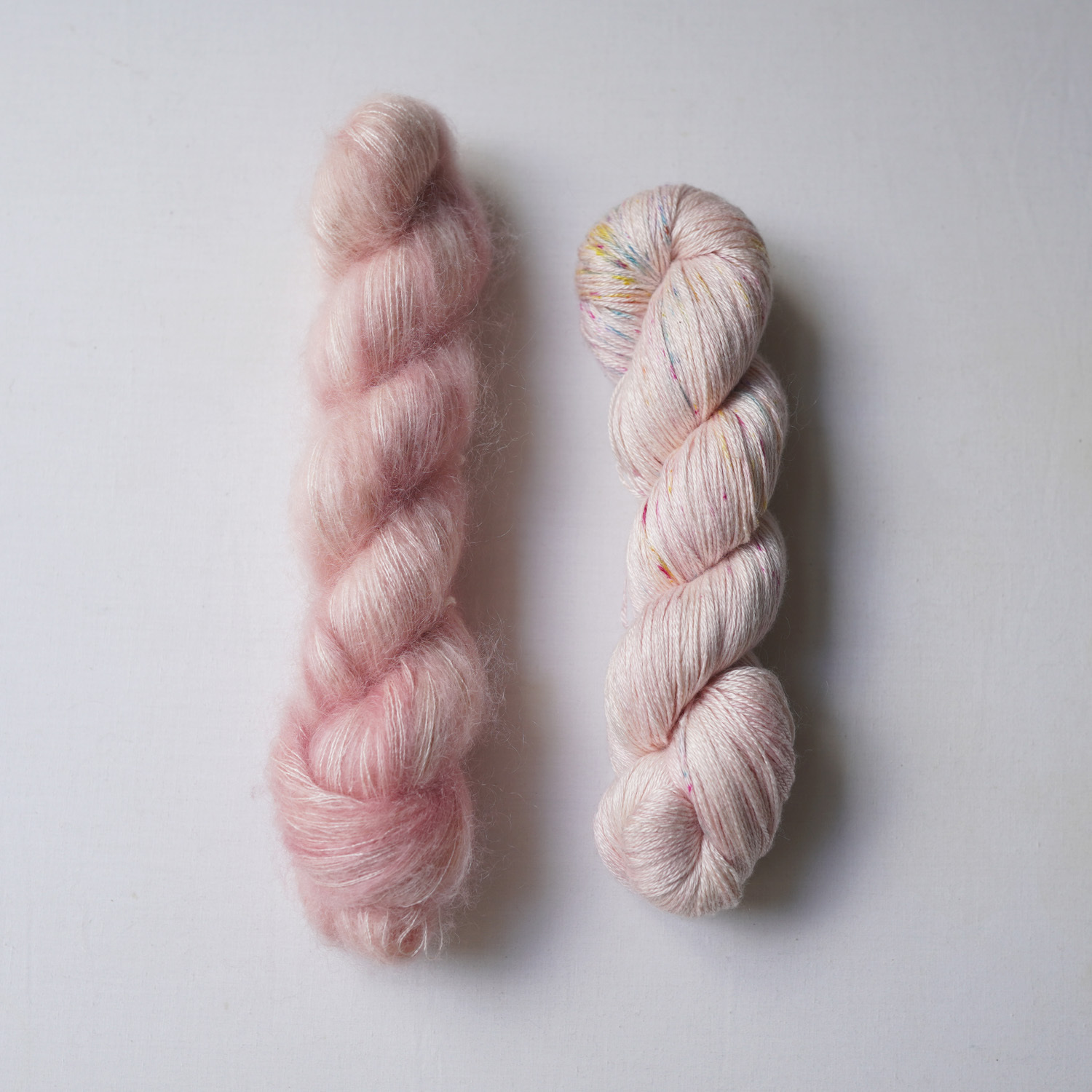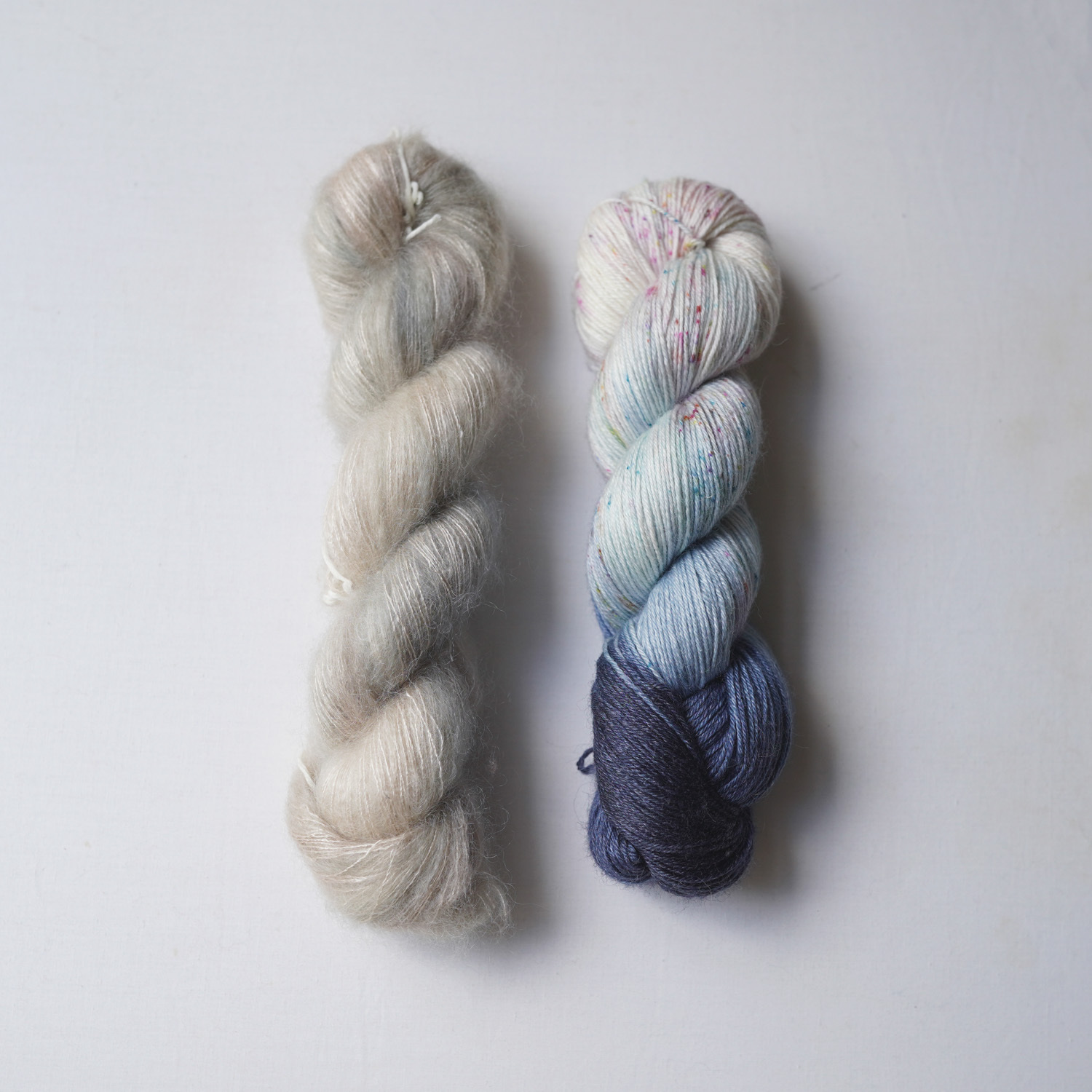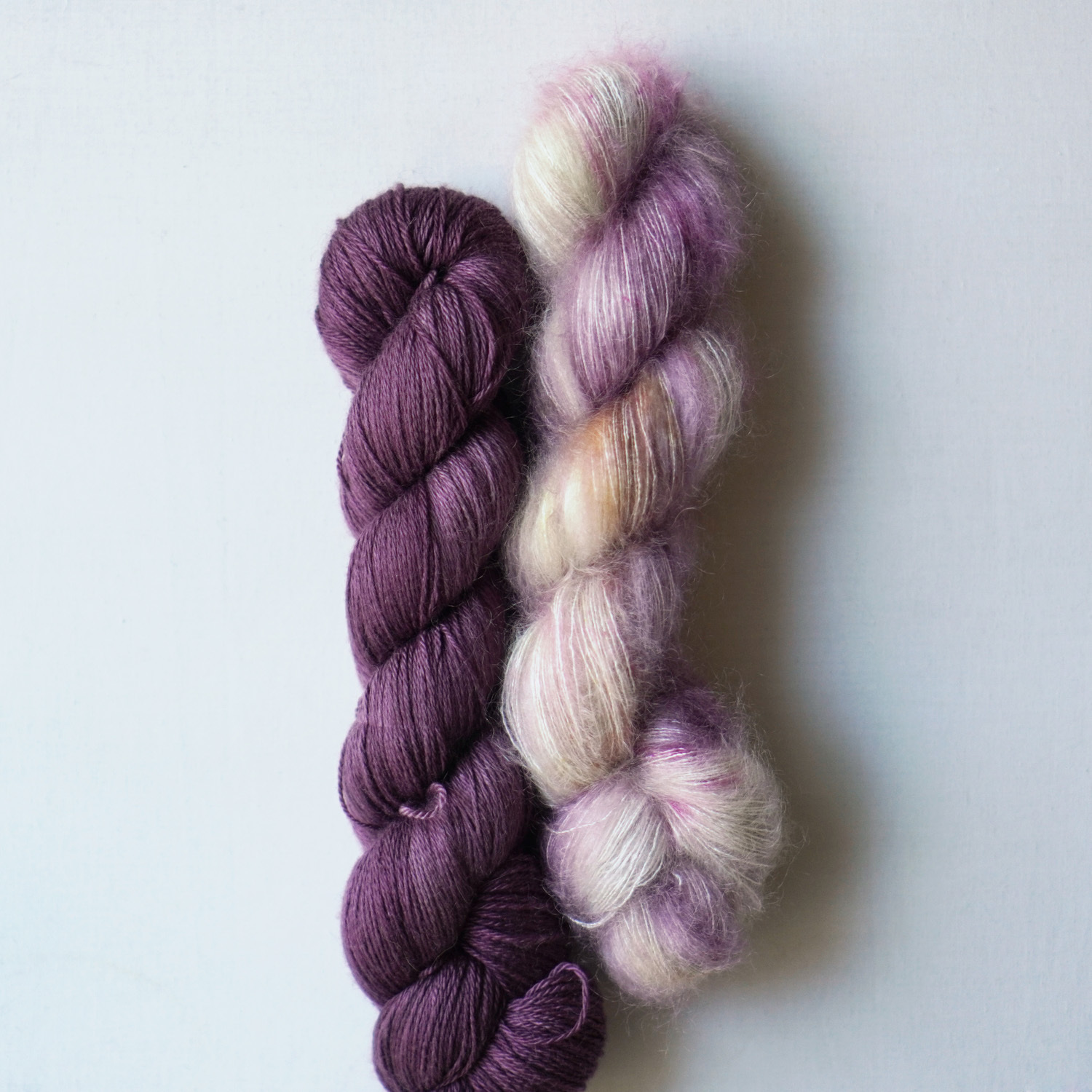 主色線用淺色但有紫色與黃色灑粉的絲毛海手染線,可以微微看到裡面衣服的版型。配色線用深紫色的蠶絲苧麻羊單色線,呼應著主色的紫色,配色非常巧妙。這是一件很快就可以織完,很適合不太冷的日子的編織作品。