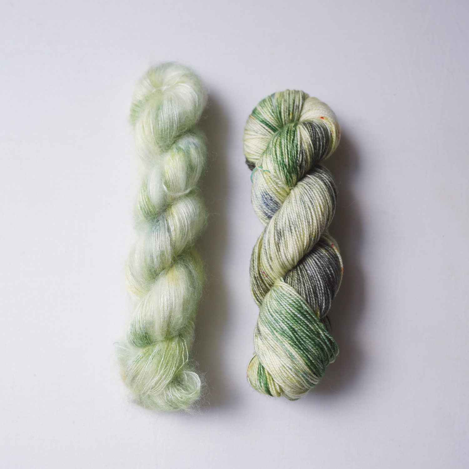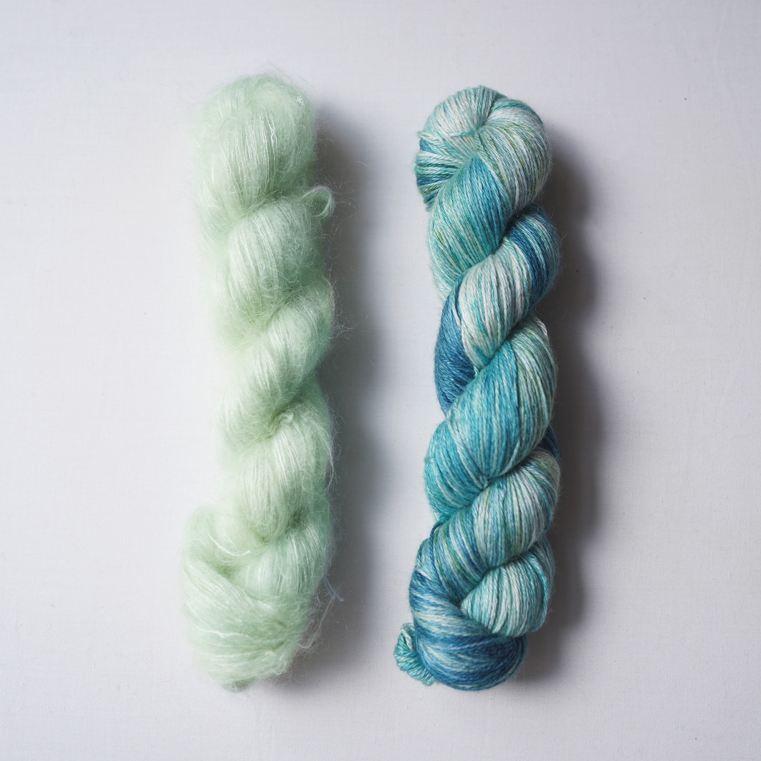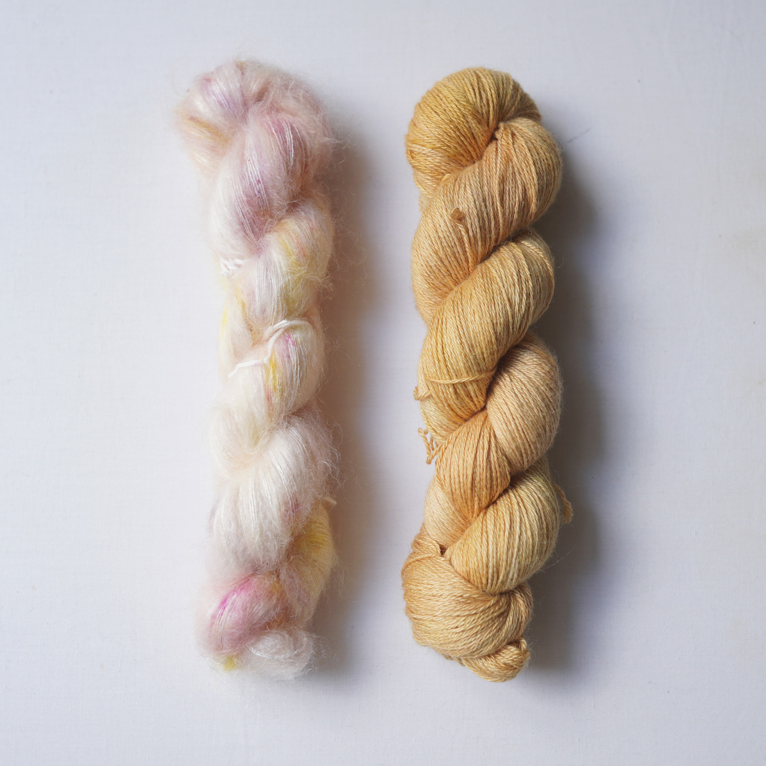 主色線用淺色但有紫色與黃色灑粉的絲毛海手染線,可以微微看到裡面衣服的版型。配色線用深紫色的蠶絲苧麻羊單色線,呼應著主色的紫色,配色非常巧妙。這是一件很快就可以織完,很適合不太冷的日子的編織作品。