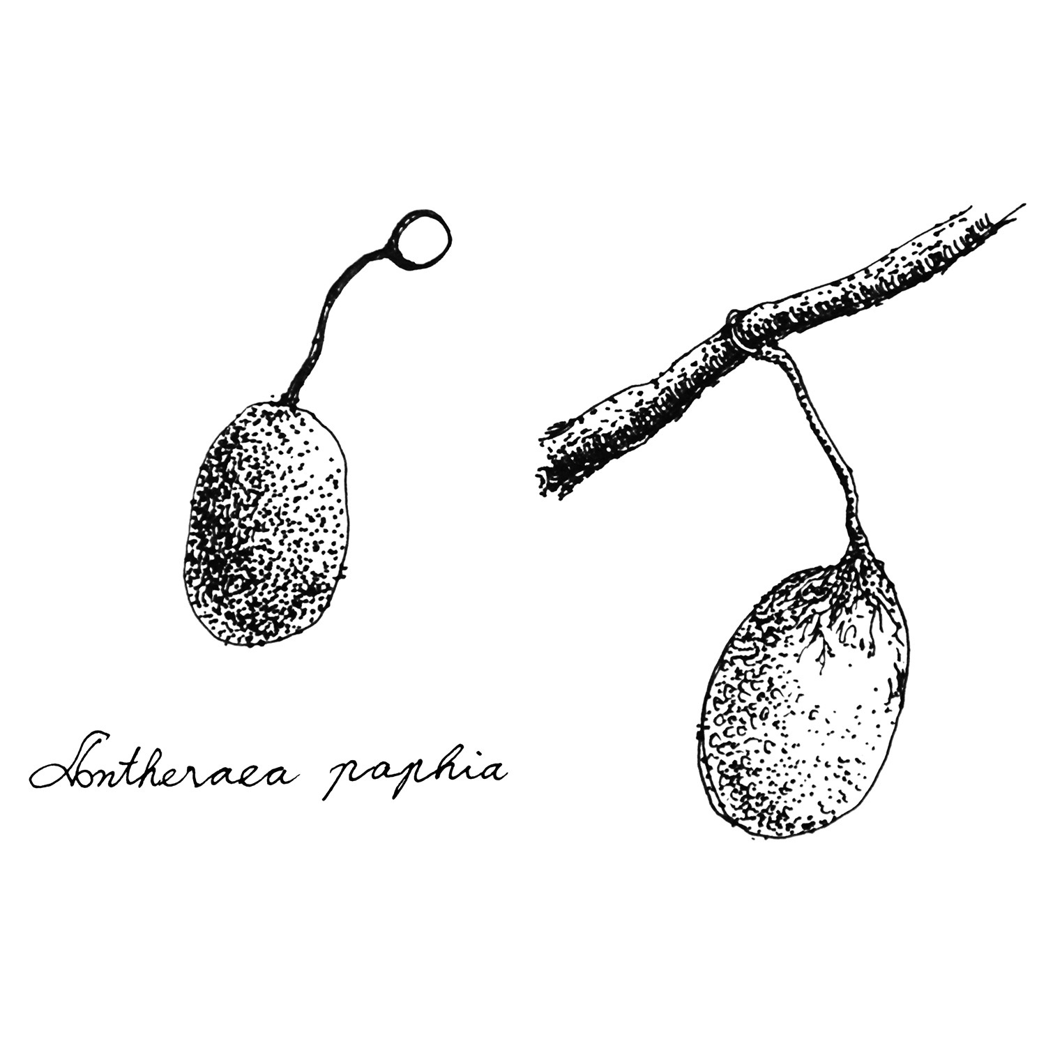 在這些野生絲線當中,熱帶Tussar野蠶的繭,不是直接附著在樹枝上,而會神奇的被一個梗狀物掛著,像是臍帶那樣黏附在樹枝上。這個梗狀物,其實是富含絲膠的絲所構成,它的顏色比繭更深,呈深灰色。