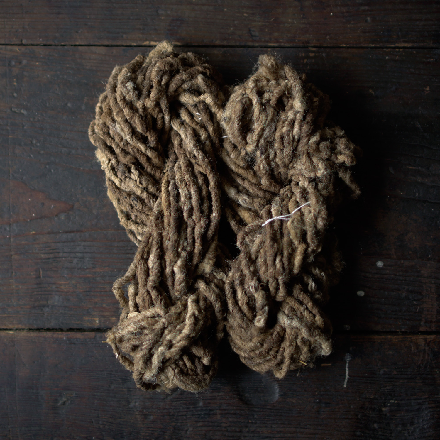 在經過初步煮軟、還未完全去除雜質時,就捻成這「類似繩子」的東西,裡頭還可以看到一些樹枝、雜質。說真的,我們也不確定可以拿這款線做什麼,但它實在是太有生命力了,怎麼樣也想要將它納入我們「富有生命力的線材」之列。