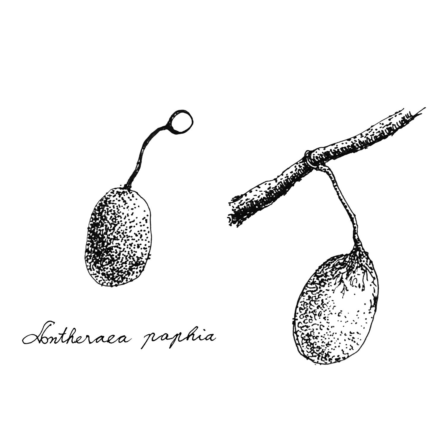 在這些野生絲線當中,熱帶 Tussar 野蠶的繭,不是直接附著在樹枝上,而會神奇的被一個梗狀物掛著,像是臍帶那樣黏附在樹枝上。這個梗狀物,其實是富含絲膠的絲所構成,它的顏色比繭更深,呈深灰色,相當堅固。