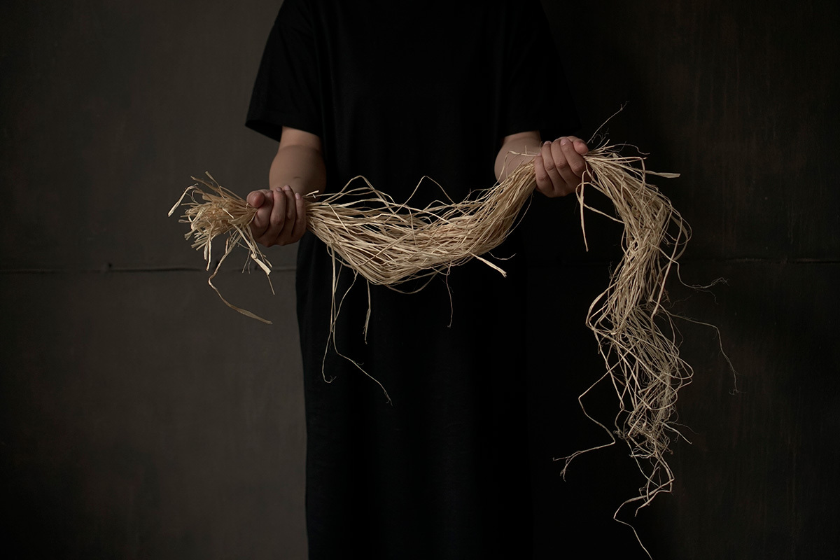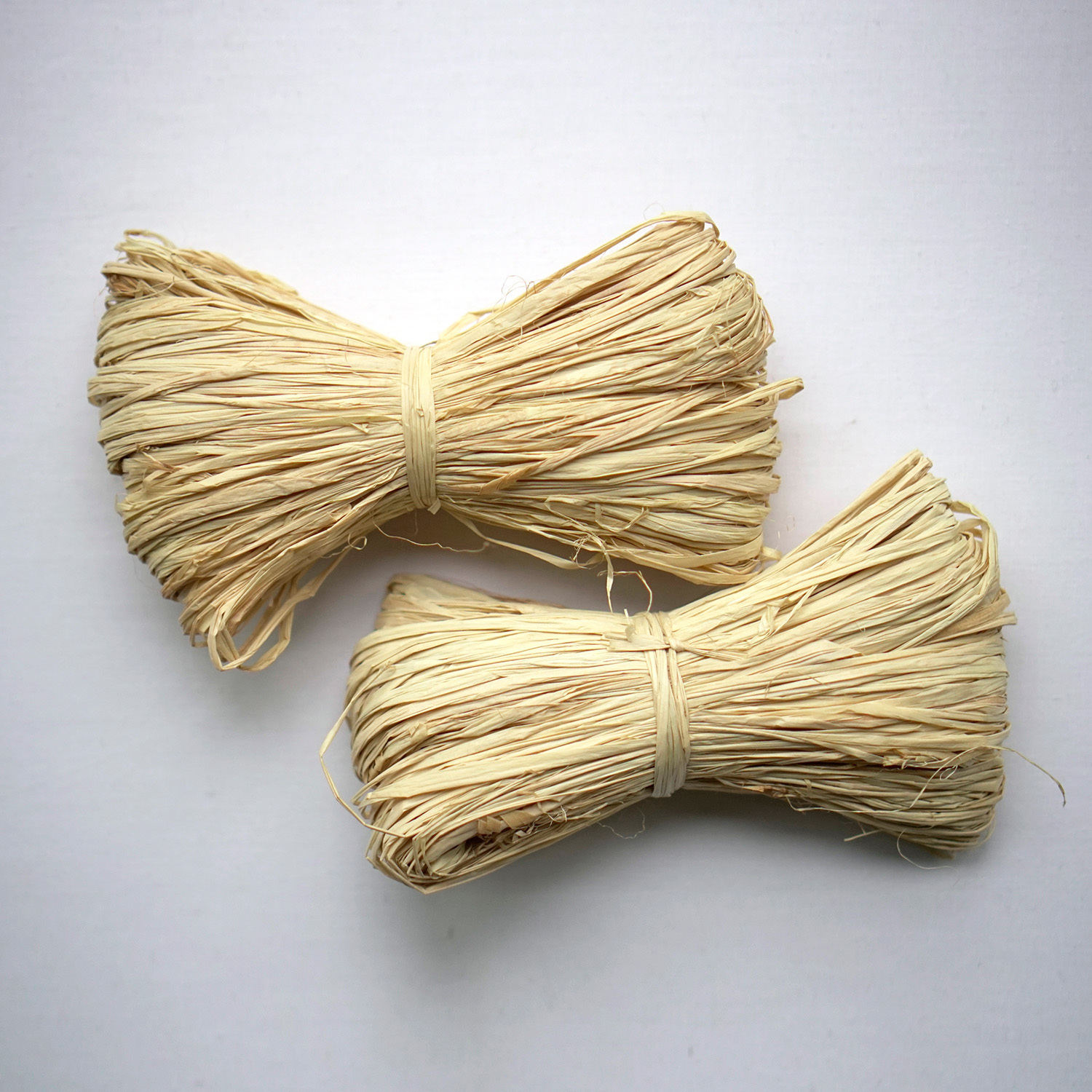 *一整捆拉菲草通常會反覆對折到一定長度後,用一條拉菲草纖維從中間綁起來固定。解開綁線後,整捆纖維就會自然散開,準備好可以使用。