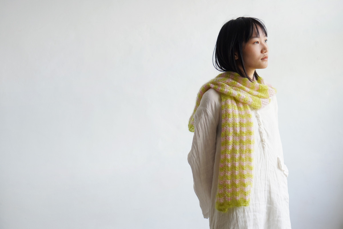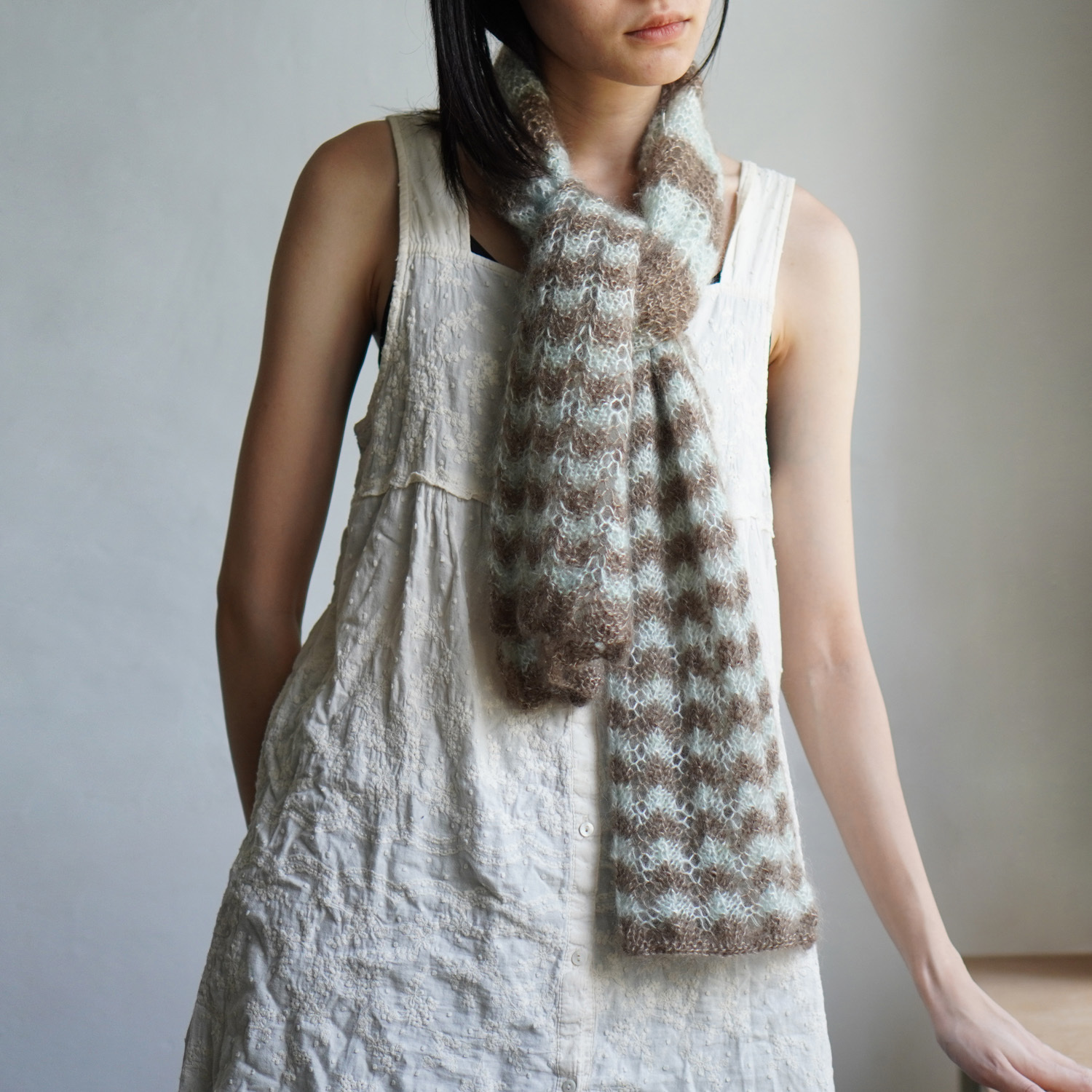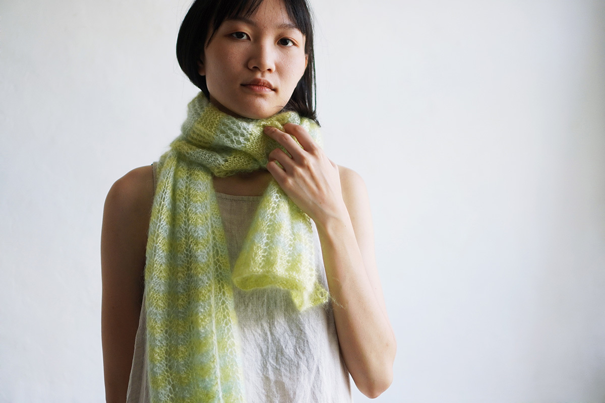 圍巾前後兩端的織法相同,中段則跳脫出來,有些起伏變化,是可愛的小細節。兩種顏色交錯重疊,讓編織的過程充滿樂趣。