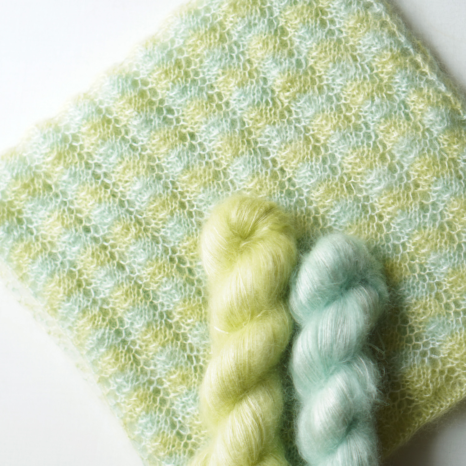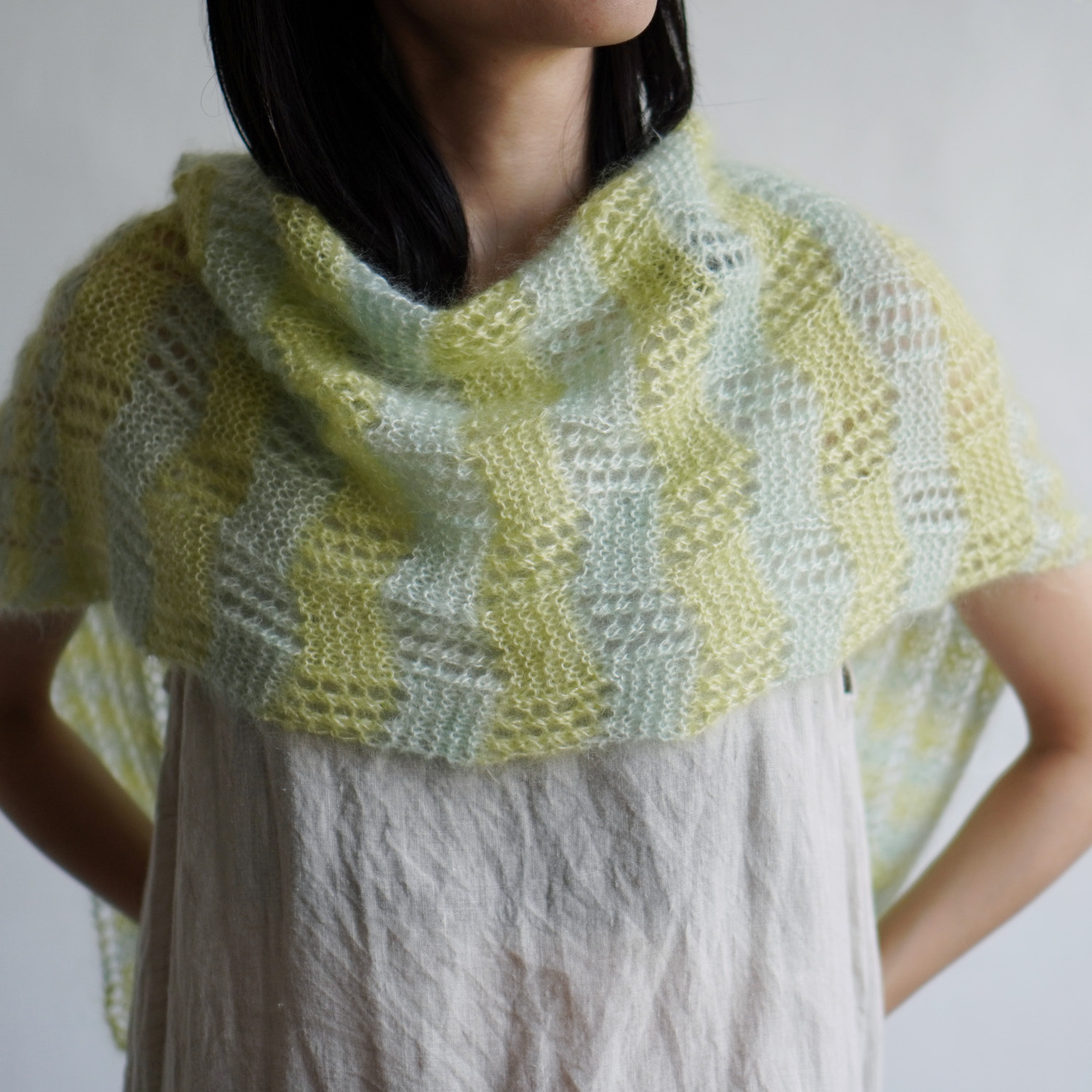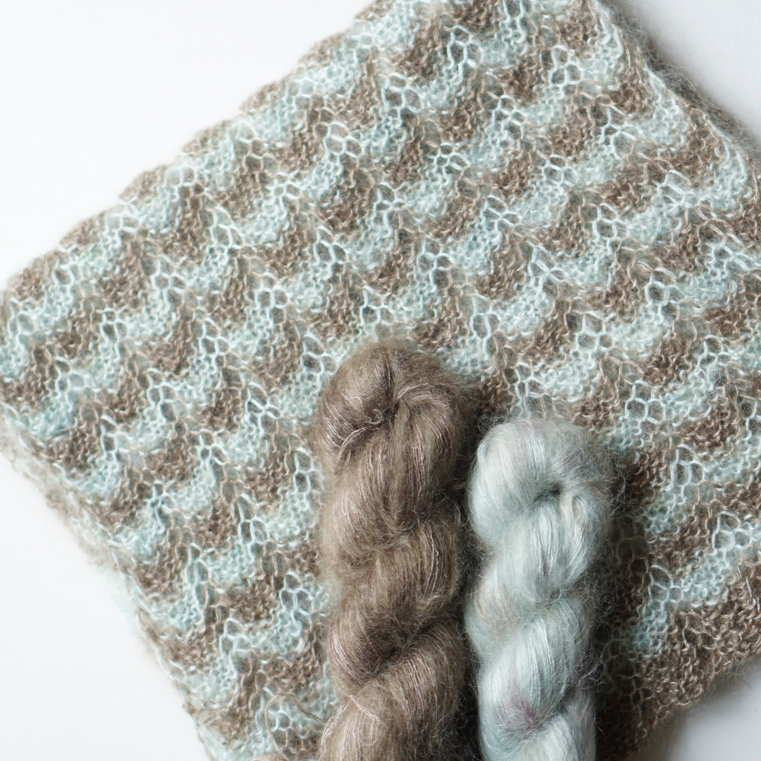 圍巾前後兩端的織法相同,中段則跳脫出來,有些起伏變化,是可愛的小細節。兩種顏色交錯重疊,讓編織的過程充滿樂趣。
