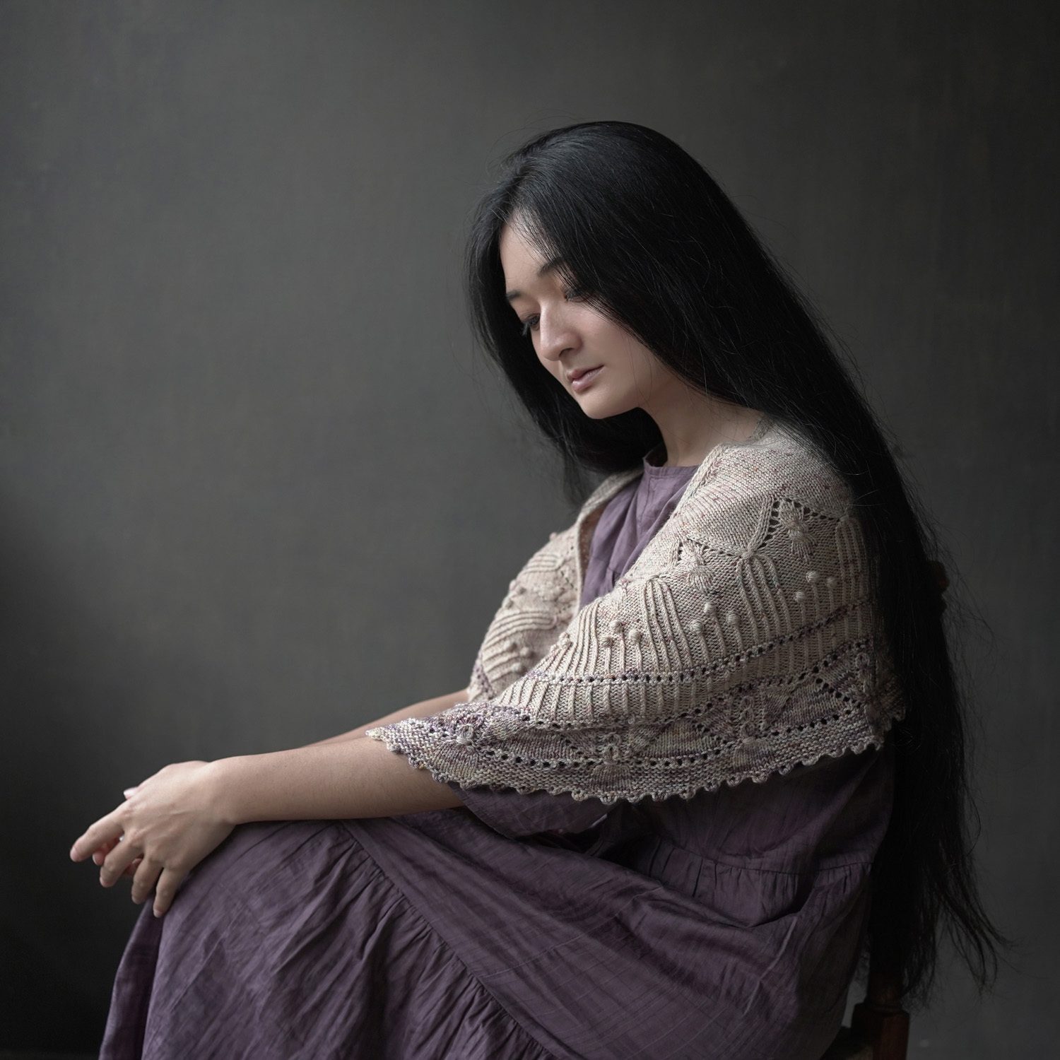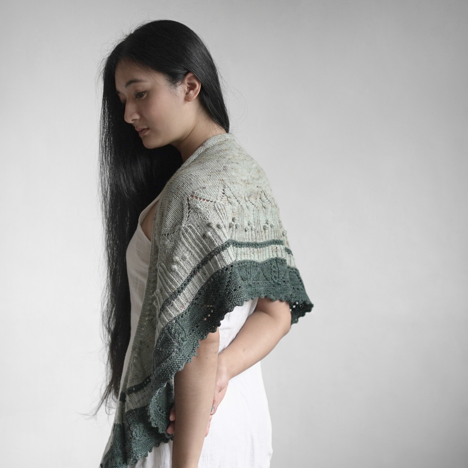 這個用兩絞線織成的披肩,由上往下編織,透過每段規律的加針,織成一個半月形的披肩。