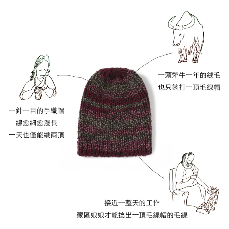 這是一頂非常單純的毛線帽。從一搓毛開始,在藏區工坊被藏族阿姨手捻成線後,再手織成毛線帽,就是這麼簡單而直接。