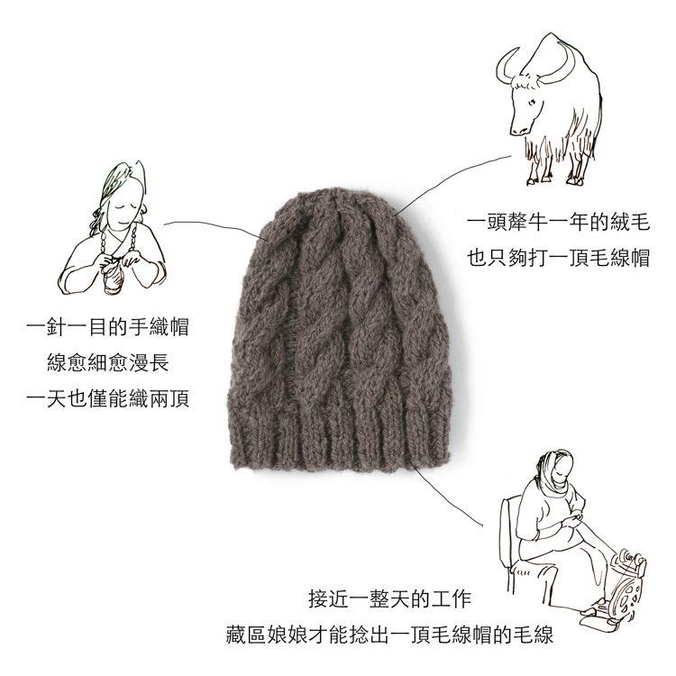 這是一頂非常單純的毛線帽。從一搓毛開始,在藏區工坊被藏族阿姨手捻成線後,再手織成毛線帽,就是這麼簡單而直接。