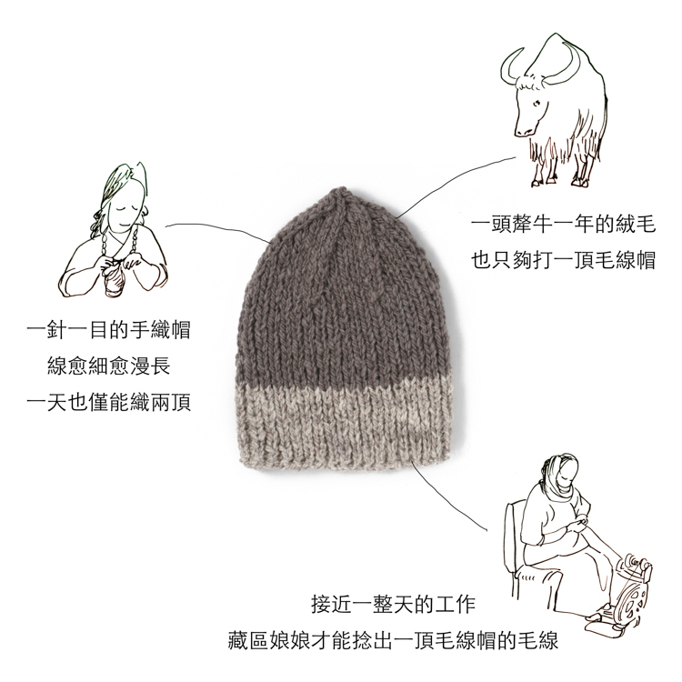 這是一頂非常單純的毛線帽。從一搓毛開始,在藏區工坊被藏族阿姨手捻成線後,再手織成毛線帽,就是這麼簡單而直接。